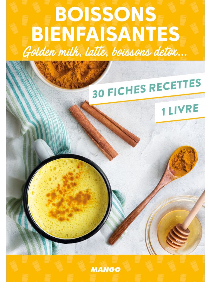 > 30 FICHES RECETTES avec des photos (golden milk, latte, moon milk, jus, eat détox, infusion, smoothie...) et pour chacune une propriété bienfaisante.